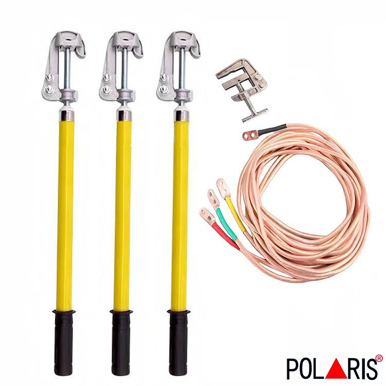 规格:三相合相式,软铜线规格3×3m + 5m,截面≥25mm²;绝缘杆3根,每根可拆分,有效绝缘长度≥1.5m;线夹为猴头式卡扣型(3只线路端+1只接地端),适配10-24mm户外架空导线,操作便捷,耐候性强,是户外线路检修的常规选择。